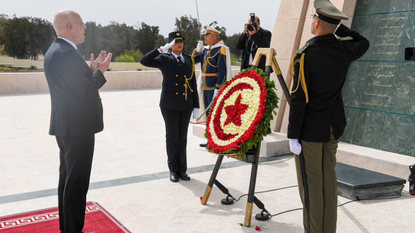 وكان رئيس الجمهورية قد أشرف صباح أمس، بروضة الشهداء بالسيجومي بتونس العاصمة، على موكب إحياء الذكرى السادسة والثمانين لعيد الشهداء. وحيا العلم على أنغام النشيد الرسمي واستعرض تشكيلة من الجيوش الثلاثة، ثم وضع إكليلا من الزهور على النصب التذكاري للشهداء وترحّم على أرواحهم الزكيّة.