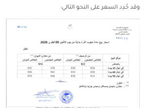 أعلن الديوان الوطني للأعلاف عن اعتماد سعر جديد لحبوب الذرة بداية من اليوم الاثنين 9 فيفري 2026، لفائدة مربي الدواجن والمجترات والهياكل المهنية الناشطة في الإنتاج الحيواني، إلى جانب مصنّعي وتجار الأعلاف الممضين على كراس شروط النشاط.
