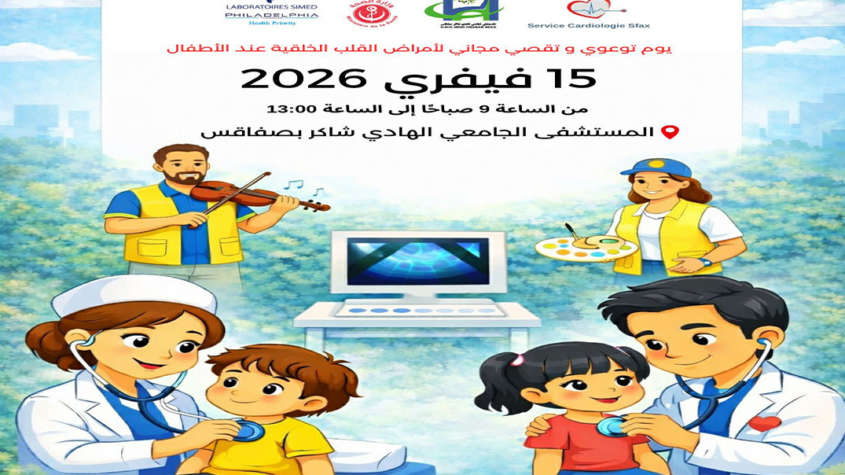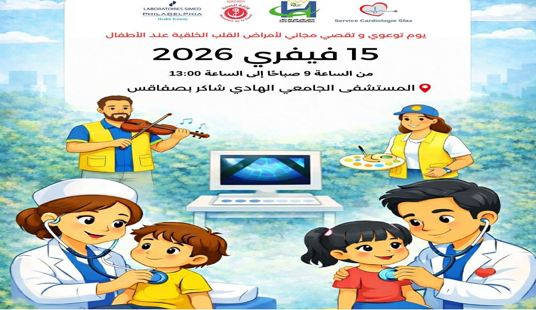 بمناسبة اليوم العالمي لأمراض القلب الخِلقية،ينظم اليوم الأحد قسم أمراض القلب بالمستشفى الجامعي الهادي شاكر بصفاقس يوماً توعوياً للتقصّي والكشف المجاني عن أمراض القلب الخِلقية لدى الأطفال من الساعة 9 صباحاً إلى الساعة الواحدة بعد الظهر.