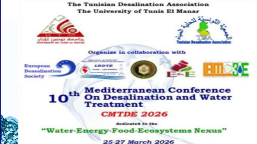 تحت اشراف وزارة التعليم العالي والبحث العلمي ووزارة الفلاحة والموارد المائية والصيد البحري تنظم جامعة تونس المنار بالتعاون مع الجمعية التونسية لمعالجة وتحلية المياه (TDA) والجمعية الأوروبية للتحلية (EDS)، الدورة العاشرة لـ “الملتقى المتوسطي حول تحلية ومعالجة المياه (CMTDE 2026)”، وذلك من 25 إلى 27 مارس 2026 بنزل “السلطان” بمدينة الحمامات.