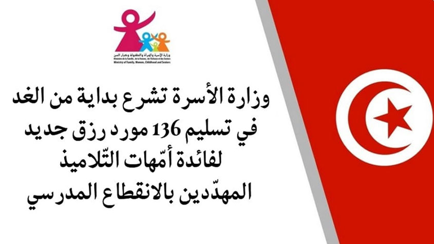 تكريسا لمبدإ تكافؤ الفرص بين الفئات والجهات وضمانا لحق التلاميذ في النفاذ إلى الدراسة وفي استكمالهم لمسارهم الدراسي ،اعلنت وزارة الأسرة والمرأة والطفولة وكبار السن انها شرعت بداية من يوم 18 سبتمبر 2024 في تسليم 136 مورد رزق جديد لفائدة أمهات التلاميذ المهدّدين بالانقطاع المدرسي في المناطق الأكثر هشاشة اقتصادية و تحديدا بولايات سيدي بوزيد وجندوبة والقيروان وزغوان ومنوبة والمهدية ونابل موزّعة على 20 معتمديّة.