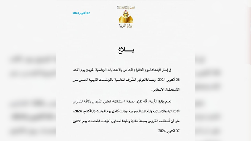 بمناسبة تنظيم الإنتخابات الرئاسية 2024: تعليق الدروس بصفة استثنائية بكافة المؤسسات التربوية والجامعية يوم 5 أكتوبر الجاري