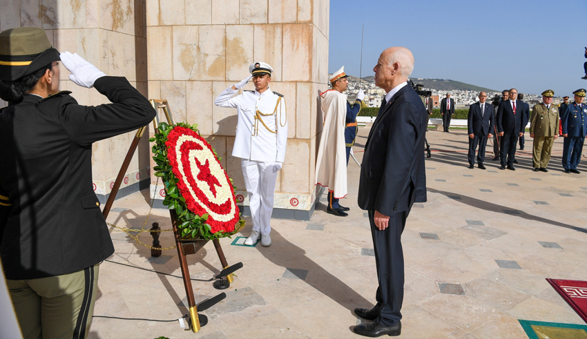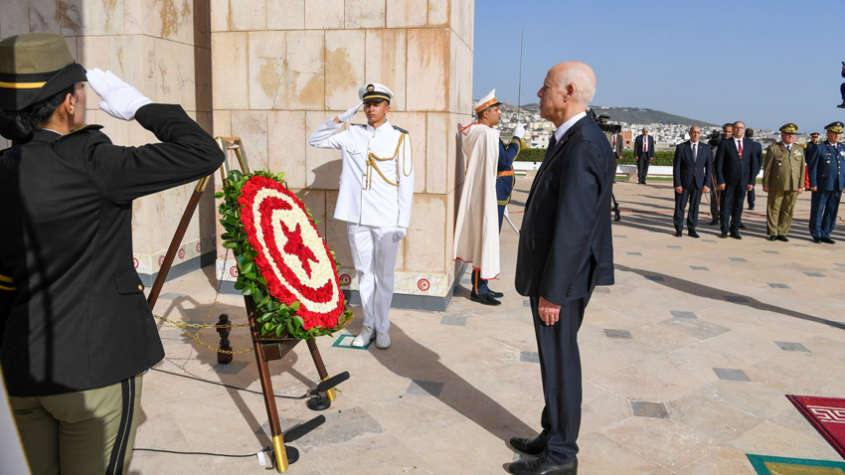 وبفضاء النصب التذكاري لروضة الشهداء ، تولى رئيس الدولة القائد الاعلى للقوات المسلحة ، وضع إكليل من الزهور،وتلاوة فاتحة الكتاب ترحّما على أرواح شهداء تونس ممن نذروا ارواحهم الزكية فداء للوطن والشعب .