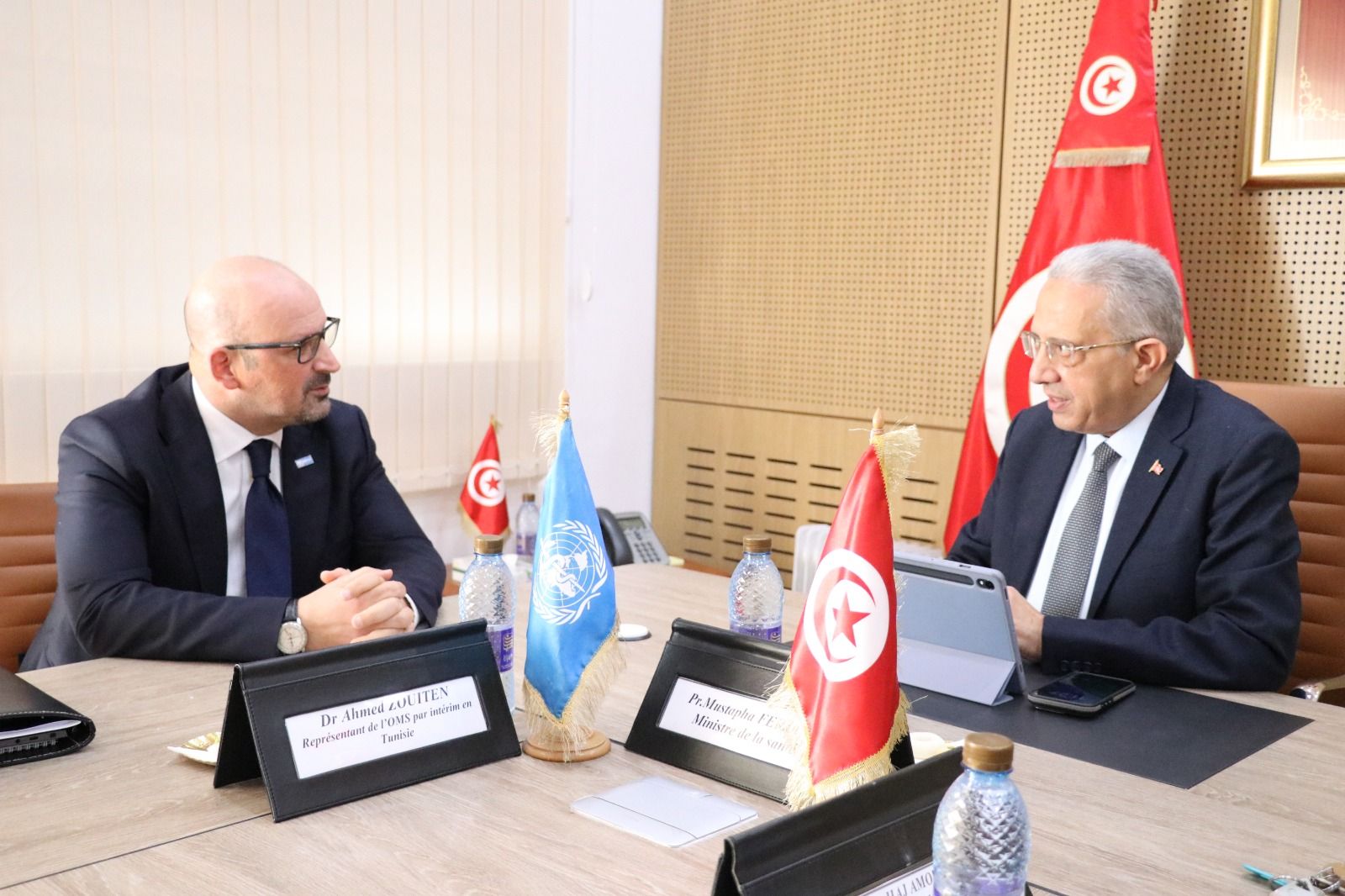 أكد وزير الصحّة مصطفى الفرجاني امس الجمعة لدى إستقباله الممثّل بالنيابة لمنظمة الصحّة العالمية في تونس،أحمد زويتن بالوزارة التزامهما المشترك بمواصلة تعزيز الشراكة الفنية لتحقيق التّنميّة الصحيّة وخاصة منها التغطية الشاملة و ضمان العدالة الصحيّة والمضيّ قدما في عمليّة الإصلاح.