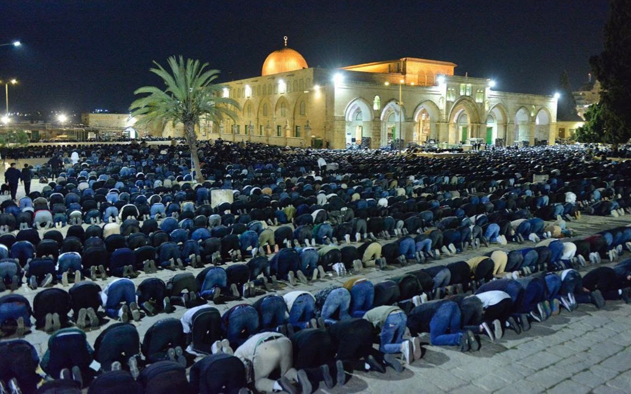 أدى نحو 100 ألف شخص صلاتي العشاء والتراويح في رحاب المسجد الأقصى المبارك وسط مدينة القدس، في أول يوم جمعة من شهر رمضان، رغم القيود التي تفرضها السلطات الصهيونية على مدينة القدس ومحيط البلدة القديمة