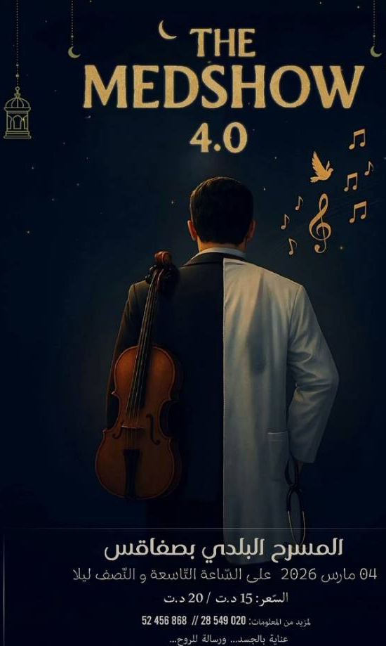 في إطار الجمع بين الرسالة الإنسانية للطب وقيم الفنّ النبيل، ينظم نادي طلبة كلية الطب بصفاقس “ماد شو” ، بالشراكة مع جمعية صحة وبيئة، حفلًا فنيًا خيريًا يجمع بين الفن والموسيقى الأصيلة وروح التضامن، وذلك يوم الأربعاء 4 مارس 2026 بداية من الساعة التاسعة والنصف ليلًا، بفضاء المسرح البلدي بصفاقس.