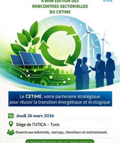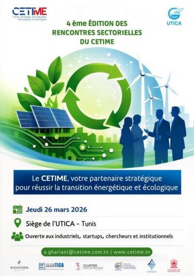 تحت شعار “المركز التقني للصناعات الميكانيكية والكهربائية، شريككم الاستراتيجي لنجاح الانتقال الطاقي والبيئي”، ستنعقد يوم 26 مارس 2026 النسخة الرابعة من اللقاءات القطاعية للصناعات الكهربائية والإلكترونية والميكاترونية بمقر الاتحاد التونسي للصناعة والتجارة والصناعات التقليدية، بمبادرة من المركز التقني للصناعات الميكانيكية والكهربائية.