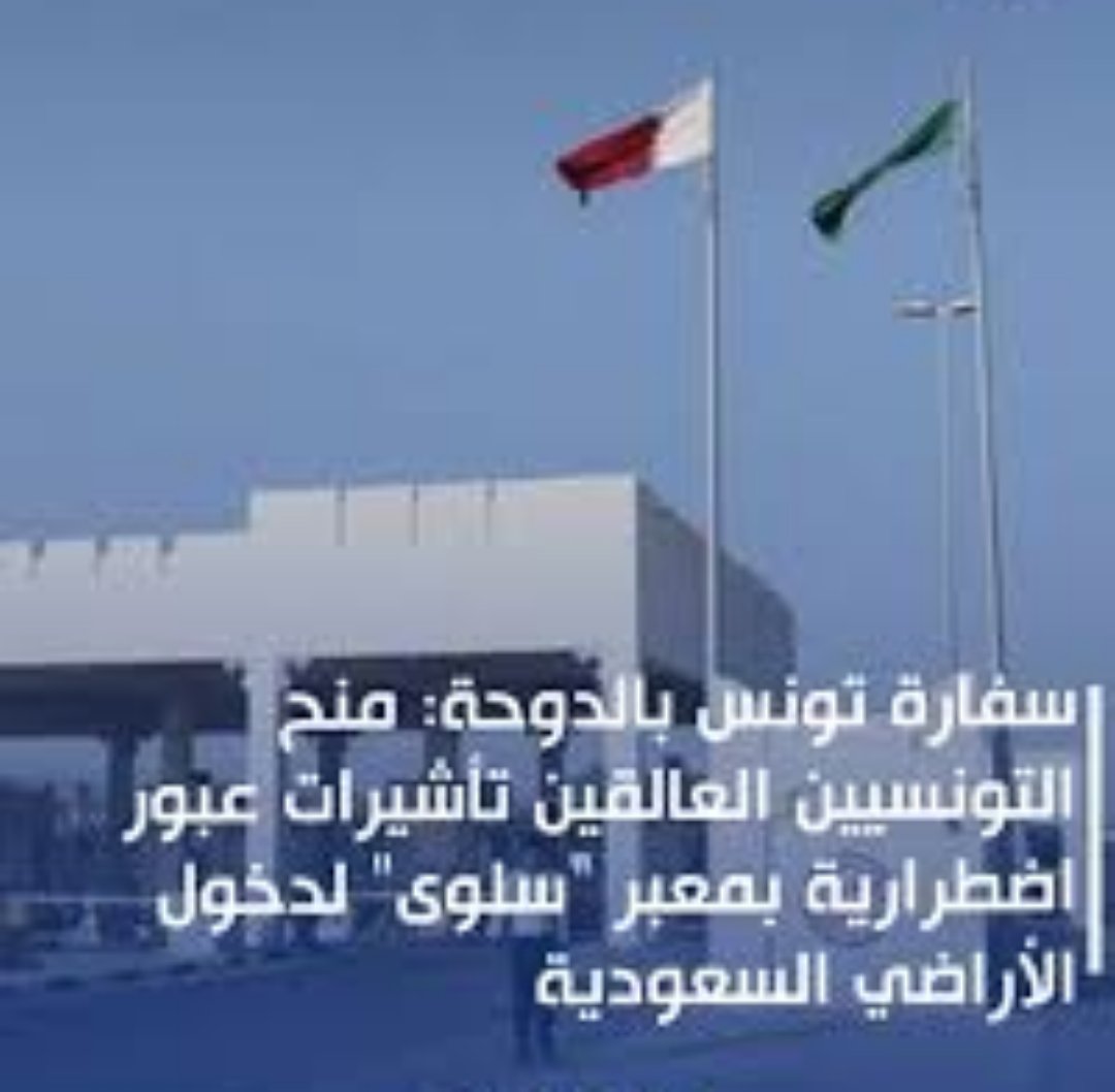 افادت سفارة الجمهورية التونسية بالدوحة بأنه بإمكان المواطنين التونسيين العالقين، في إطار زيارات عائلية أو سياحية، التوجه إلى المعبر الحدودي “سلوى”، حيث سيتم منحهم تأشيرات عبور اضطرارية لدخول الأراضي السعودية ويتسنى لهم السفر إلى تونس أو وجهات إقامتهم.