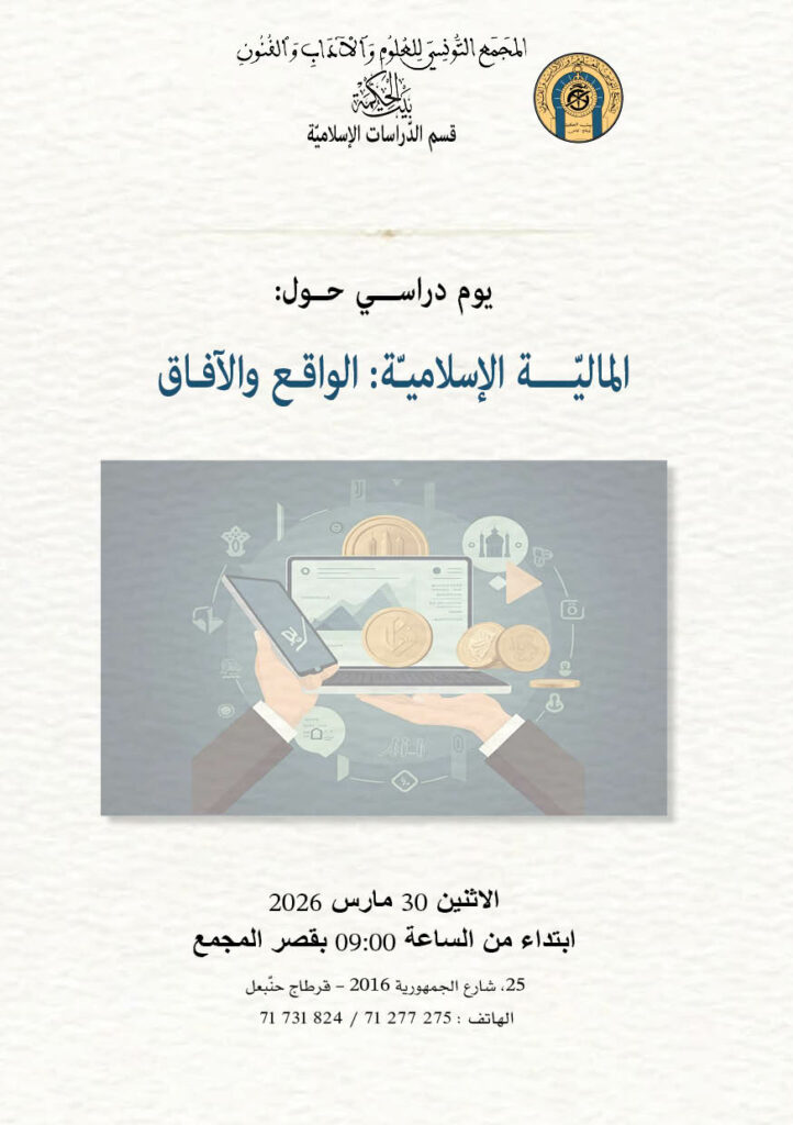 في إطار سلسلة اللّقاءات والندوات والورشات والأيّام الدراسيّة حول القضايا الدينيّة والاقتصاديّة والحضاريّة المختلفة، ينظّم قسم الدّراسات الإسلاميّة بالمجمع التونسي للعلوم والآداب والفنون “بيت الحكمة” يوم الاثنين 30 مارس 2026 يوما دراسيّا حول قضايا نشأة الماليّة الإسلاميّة، أهدافها الكبرى، خصوصياتها، والمعاملات البنكيّة المميّزة لها والتجارب العمليّة للماليّة الإسلاميّة في تونس وخارجها، إلى جانب مسألة التكوين الجامعي والبحثي في مستوى الإجازة و الماجستير و الدكتوراه.