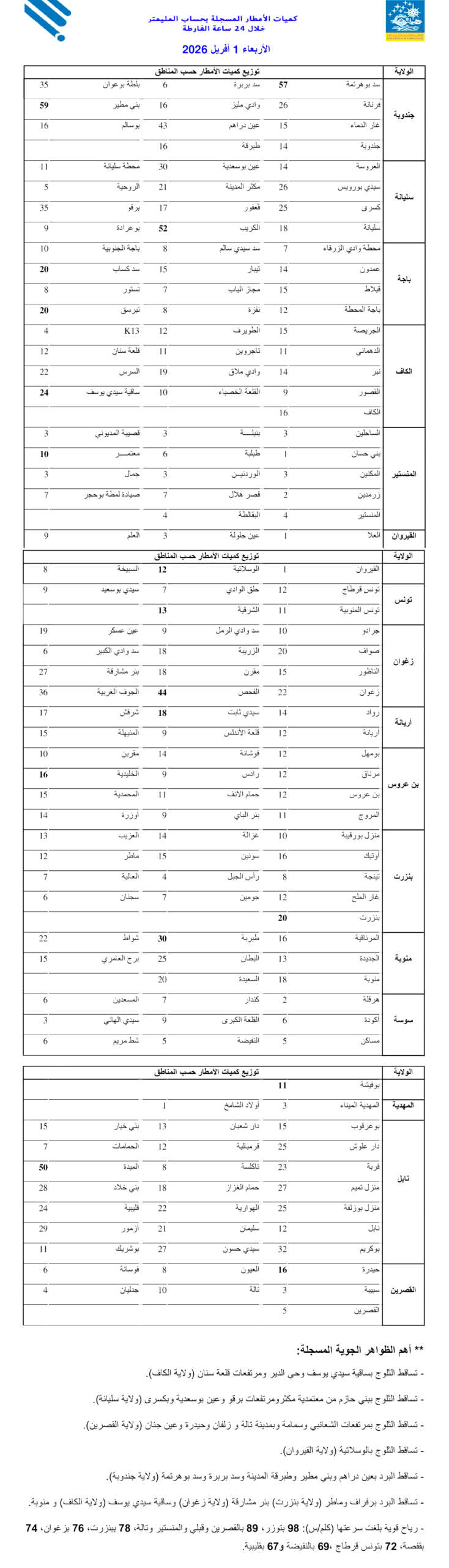 نشر المعهد الوطني للرّصد الجوي، اليوم الأربعاء 01 أفريل 2026، قائمة كميات الأمطار المسجلة بعدد من المناطق خلال الـ24 ساعة الماضية.