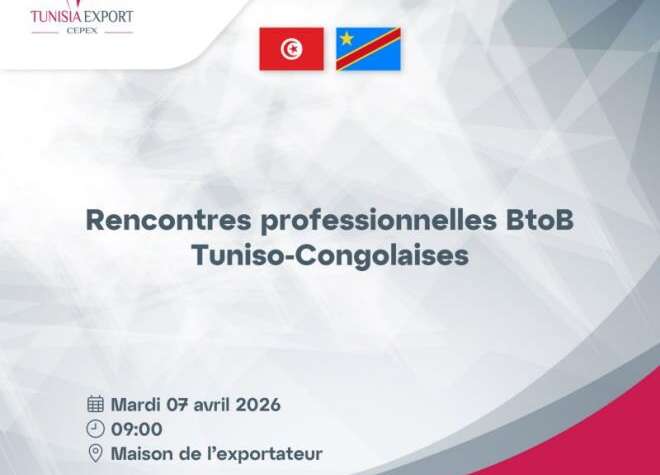 ينظم مركز النهوض بالصادرات بالتعاون مع سفارة تونس في كينشاسا، لقاءات مهنية ثنائية تونسية-كونغولية، وذلك يوم الثلاثاء 7 أفريل الجاري بدار المصدّر بالعاصمة.