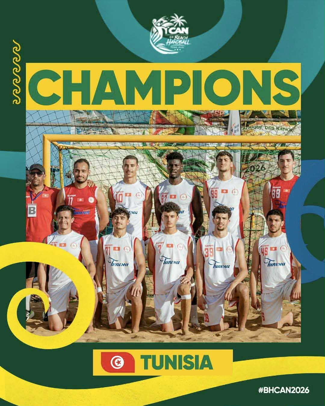 توج عشية اليوم المنتخب الوطني التونسي لكرة اليد الشاطئية ببطولة افريقيا لكرة اليد الشاطئية المقامة بالعاصمة بالطوغولية لومي اثر فوزه في الدور النهائي على منتخب البلد المنظم الطوغو بشوطين لصفر 2 / 0 تفاصيلها 19\18 و18\16