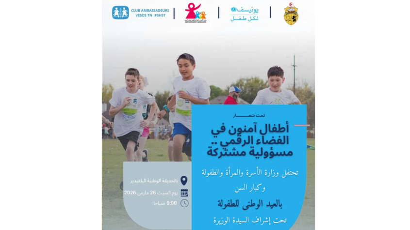 في إطار الاحتفال بالعيد الوطني للطفولة الذي يلتئم هذه السنة تحت شعار “أطفال آمنون في الفضاء الرقمي. مسؤوليّة مشتركة”، تنظّم وزارة الأسرة والمرأة والطفولة وكبار السن بالتعاون مع الجمعيّة التونسيّة لقرى الأطفال “س أو س” ماراطون للأطفال والأسر يوم السبت 28 مارس الجاري بداية من الساعة التاسعة صباحا بحديقة البلفيدير بتونس العاصمة. ودعت وزارة الأسرة والمرأة والطفولة وكبار السن في بلاغ لها اليوم الجمعة 27 مارس الأطفال مرفوقين بأسرهم إلى الحضور والمشاركة في هذه التظاهرة، لافتة إلى أن العديد من…