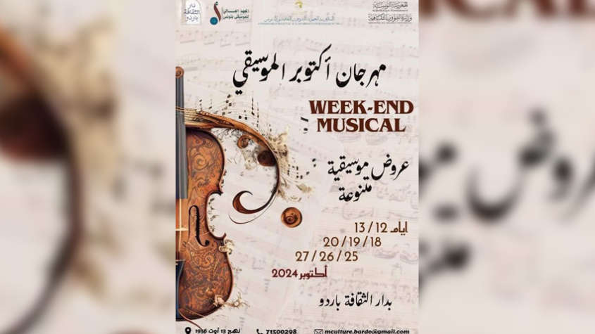 تحت إشراف وزارة الشؤون الثقافية تنظم المندوبية الجهوية للشؤون الثقافية بباردو بالاشتراك مع المعهد العالي للموسيقى بتونس ودار الثقافة بباردة مهرجان أكتوبر الموسيقي Week-End Musical أيام 12 و13 و18 و19و20 أكتوبرو 25 و 26 و27من نفس الشهر بدار الثقافة بباردو ، ويحيي سهرة افتتاح المهرجان الفنان نضال يحياوي فيما يخصص يوم الأحد 13 أكتوبر من الساعة العاشرة صباحا حتى الواحدة بعد الظهر لأشغال ورشة Creation des chanso تقوم بتأطيرها الأستاذة مريم بن توهامي التي تعيدن نفس أشغال هذه الورشة يوم…